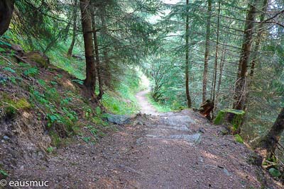 Knapp 20 Meter nachdem man die Seilbahntrasse unterquert hat, biegt man nach rechts auf einen schmalen Pfad ab. Diesem folgt man durch den Wald nach Norden.