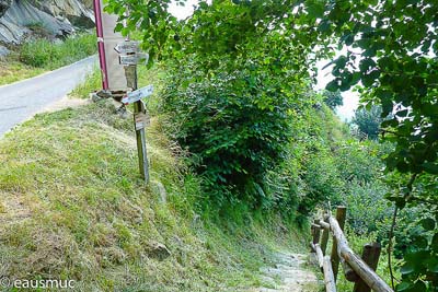 Nach etwa 500 Metern trifft man auf den Wanderweg T2. (WP8) Diesem folgt man nach Süden, bis man nach ca. 200 Metern auf der Rückseite des Ristorante Wasserfall auf den kurzen Abzweig zum oberen Aussichtspunkt auf den Partschinser Wasserfall trifft.