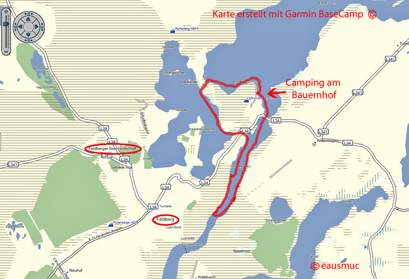 Start und Ziel dieser Tour ist der Campingplatz am Bauernhof bei Feldberg, Mecklenburg Vorpommern. Die Tour führt über den breiten und schmalen Luzin, als auch über den Haussee.