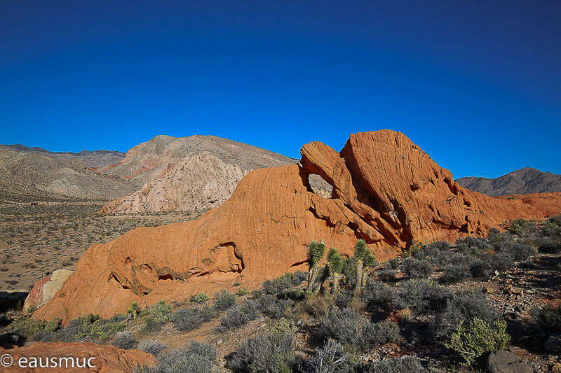 Um die Runde zu komplettieren wendet man sich nach Norden. An den Campern des Boondockingplatzes vorbei hält man auf das Felsmassiv zu. Dort fällt einem sofort ein Arch ins Auge.