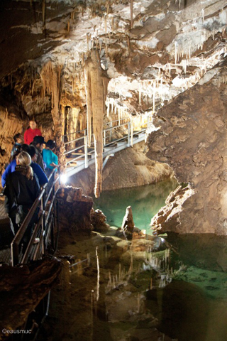 Die Gruppe, die gerade die Höhle besucht hatte kommt zurück, und mir wird schlecht. Etwa 30 Leute kommen die Treppe herunter. So viele Leute auf einmal, das mag ja ein schöner Krach in der Grotte sein. Es zahlt sich aus, dass ich in der Früh nicht in die Gänge gekommen bin. Ausser mir warten nur noch 6 andere auf den Beginn der Führung.