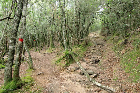 Laut Wanderführer sind es ca. 5,5 KM, also eine nette kleine Runde. Ich packe meinen Rucksack und los geht´s. Der Weg verläuft weitestgehend im Wald, einen Ausblick auf die Landschaft hat man am Anfang gar nicht. Ab und zu tröpfelt es, die Steine sind zum Teil ganz schön glatt. Manchmal ist man gezwungen, kleine Umwege zu laufen. Der offizielle Weg ist weggespült.