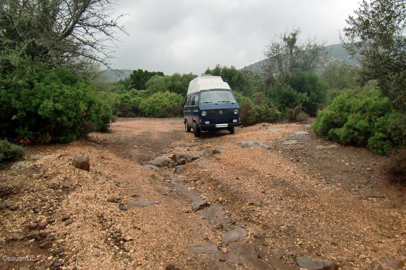 Die Wanderung zur Cala Goloritze schlage ich mir aus dem Kopf. Bei diesem Wetter, nein Danke. Da ich aber schon mal hier oben bin möchte ich mir etwas anderes ansehen. Die Anfahrt ist tückisch, der Boden sehr tief. Bevor ich steckenbleibe, lasse ich den Bus stehen und laufe die letzten Meter zu Fuß.