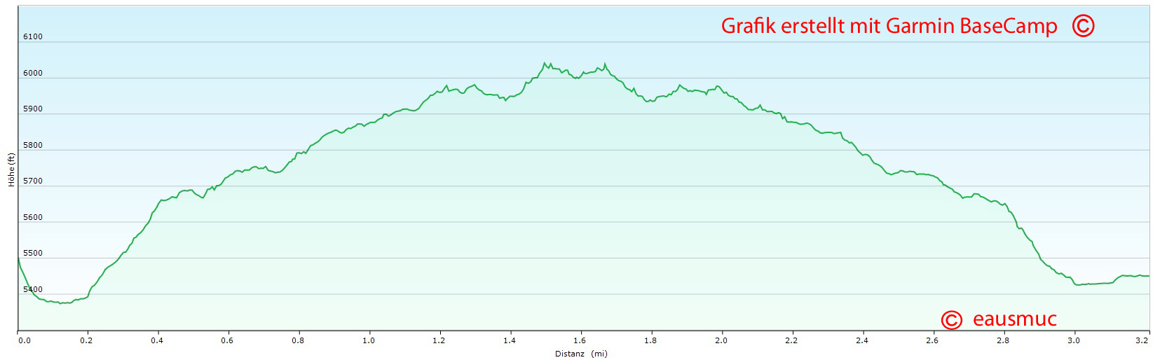 Die Traillänge beträgt ca. 3,2 Meilen, (5,1 KM) der Höhenunterschied in jede Richtung etwa 890 Fuß. (270 Meter) Der Zeitbedarf liegt bei 1 1/2 bis 2 Stunden. Ich würde den Tail als moderately strenuous / mäßig anstrengend einstufen.