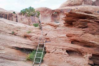 Man folgt dem gut sichtbaren Trail über ein Felsplateau hinweg bis zu einer Felsstufe. Ein Stahlseil und eine Leiter erleichtern den Aufstieg. Hat man den Aufstieg geschafft, steht man schon fast unterhalb des Bow Tie Arch. Von hier aus sind es nur noch 150 Meter bis zum Corona Arch.