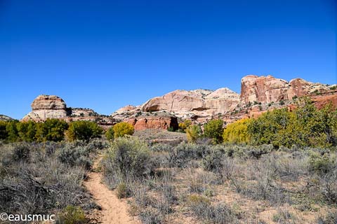 Der Trail beginnt in der südwestlichen Ecke des Parkplatzes und führt gerade auf den Escalante River zu. Diesen muss man sowohl auf dem Hin- als auch auf dem Rückweg je 8 x durchqueren. Nasse Füße sind also vorprogrammiert. Bei meinen Besuchen im Frühjahr und im Herbst betrug die Wassertiefe immer zwischen 25 und 30 cm.