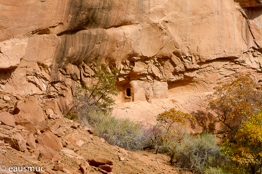 Die Junction Ruins liegen etwas abseits am Eingang zu einem Seitencanyon. Es wäre schade, sie nur aus der Ferne zu beobachten, denn unterhalb der weit sichtbaren Behausungen liegen am Fuß der Felswand einige frei zugängliche Überreste.