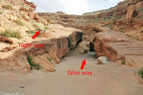 Anfangs läuft man ganz entspannt im Wash, dann lauert eine kleine Falle in Form einer hohen Felsstufe. Kurz bevor es in diesen Trichter geht, muss man den Wash verlassen und die Felsstufe auf der linken Seite umgehen. Anschließend muss man sich entscheiden. Quo Vadis?