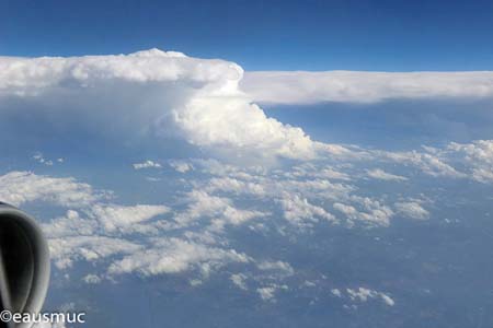 Dann folgt der übliche Terminalwechsel, und das Warten beginnt. Es gibt anscheinend keine Crew für den Flieger. Mit 30 Minuten Verspätung geht es aber los. Auch auf diesem Flug gibt es keine Sicht, dafür viele viele Wolken. Im Südwesten werden die Wolken weniger, es ist aber sehr dunstig. Der Flug zieht sich, ich kann die Landung kauf erwarten.