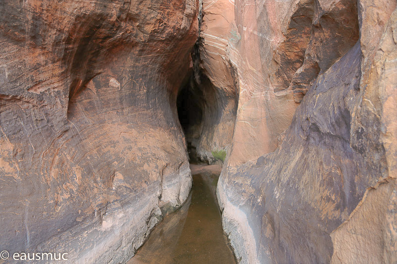 Es ist wie befürchtet. Am Eingang steht tiefes Wasser, das allerdings nicht so trüb wie im Tunnel Slot ist. Da ich alleine bin, ziehe ich meine Klamotten aus und gehe bis zu den Oberschenkeln ins Wasser. Das Wasser ist eiskalt, und ich fange sofort an zu frieren. Das ist es mir nicht wert und kehre um, eine Erkältung ist das letzte was ich will. Wieder angezogen kehre ich zurück zum Womo und fahre nach Escalante. Inzwischen ist die Lieferung für den Supermarkt eingetroffen, jetzt gibt es Bananen, Salat und Kohle, das BBQ am Abend ist gerettet.